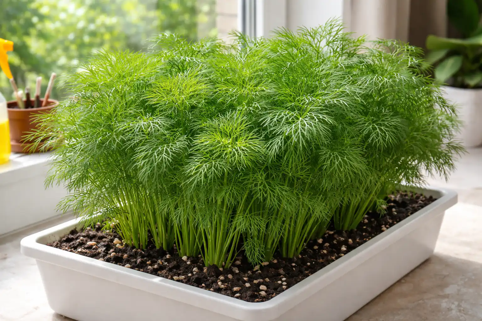 Głównym sekretem sukcesu jest nie sianie kopru w głębokich doniczkach. Jego system korzeniowy jest powierzchowny, więc w szerokich i płytkich tacach wilgoć jest rozprowadzana równomiernie, co wyklucza pojawienie się pleśni u podstawy łodygi.