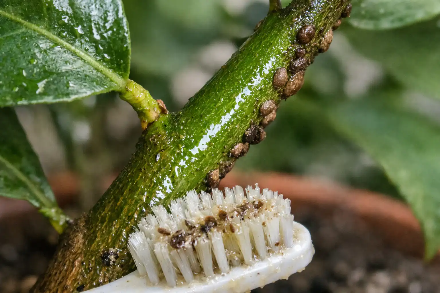 Jeśli liście cytryny są lepkie, a łodygi mają dziwne brązowe płytki, drzewo jest atakowane. tarcznik. Wiosną, wraz z początkiem ruchu soków, szkodnik ten rozmnaża się błyskawicznie, wysysając wszystkie soki z rośliny. Wypróbowałem dziesiątki metod, od alkoholu po środki owadobójcze, i znalazłem kombinację, która oczyszcza koronę w jeden wieczór bez szkody dla przyszłych owoców.