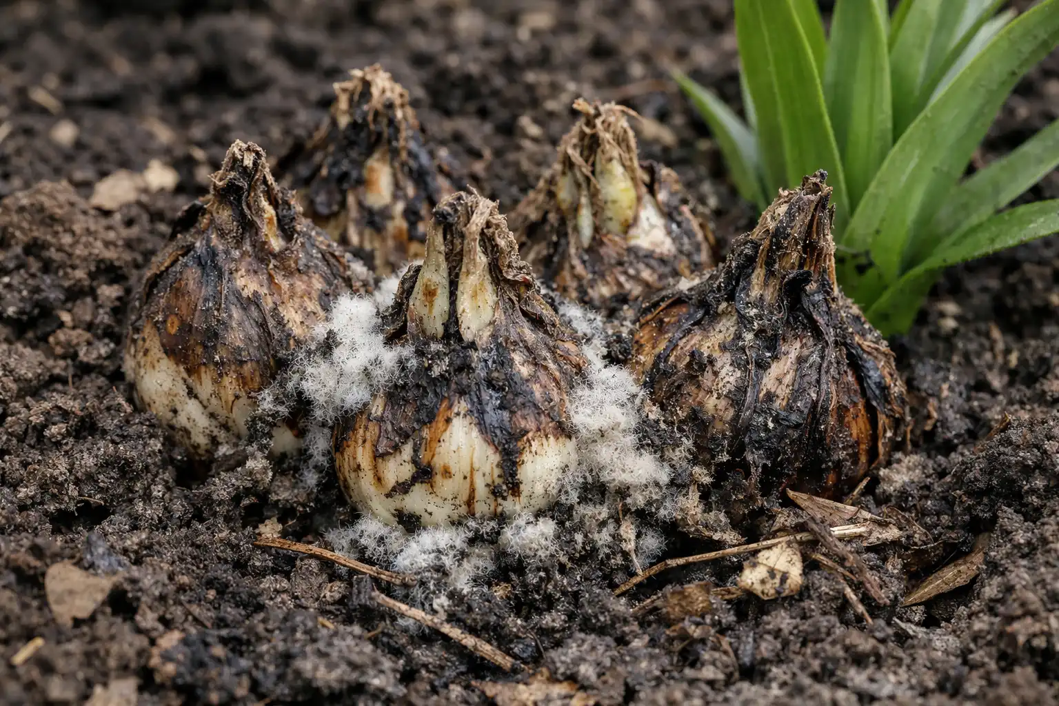 Sadzenie „na poduszce piaskowej” (garść piasku pod podstawą i wokół cebulki) wiosną zapobiegnie jej gniciu w roztopionej wodzie.