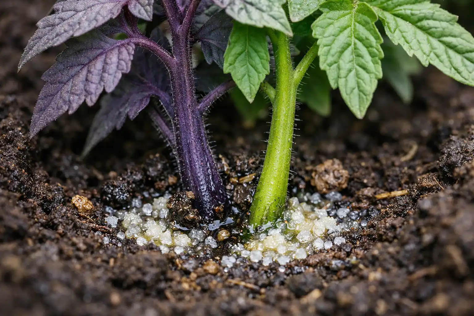 Gdy temperatura gleby spada poniżej 14°CSystem korzeniowy pomidorów praktycznie przestaje asymilować fosfor. Nawet jeśli pierwiastek ten występuje obficie w glebie, w zimnej glebie jest przekształcany w formę niedostępną dla rośliny. W rezultacie tkanki gromadzą antocyjany – pigmenty, które nadają bardzo niebiesko-fioletowy kolor. Jest to reakcja obronna na stres związany z zimnem i światłem.