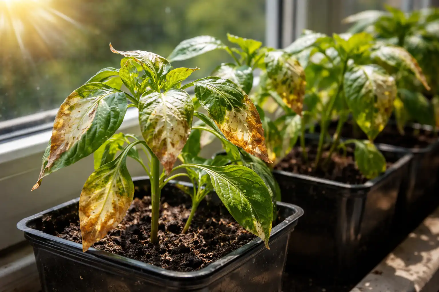 Główna pułapka polega na tym, że wiosenne słońce jest zwodnicze. Szyba w oknie działa jak szkło powiększające, koncentrując promienie na sadzonce. tkanki fotosyntetyczne. Papryki, które rosły pod fitolampami lub przy pochmurnej pogodzie, są szczególnie dotknięte: ich komórki nie miały czasu na wytworzenie pigmentów ochronnych.