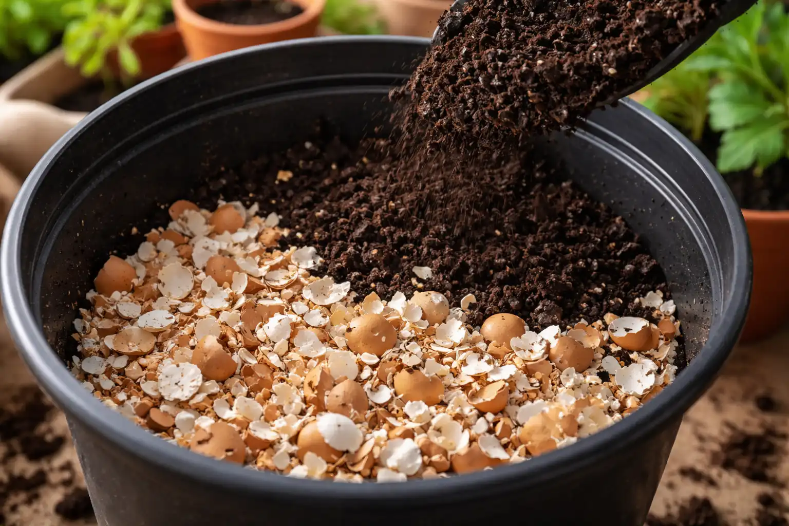 Duże kawałki muszli na powierzchni gleby mogą odstraszać ślimaki, ale wewnątrz doniczki pełnią jedynie funkcję drenażową i odżywczą.