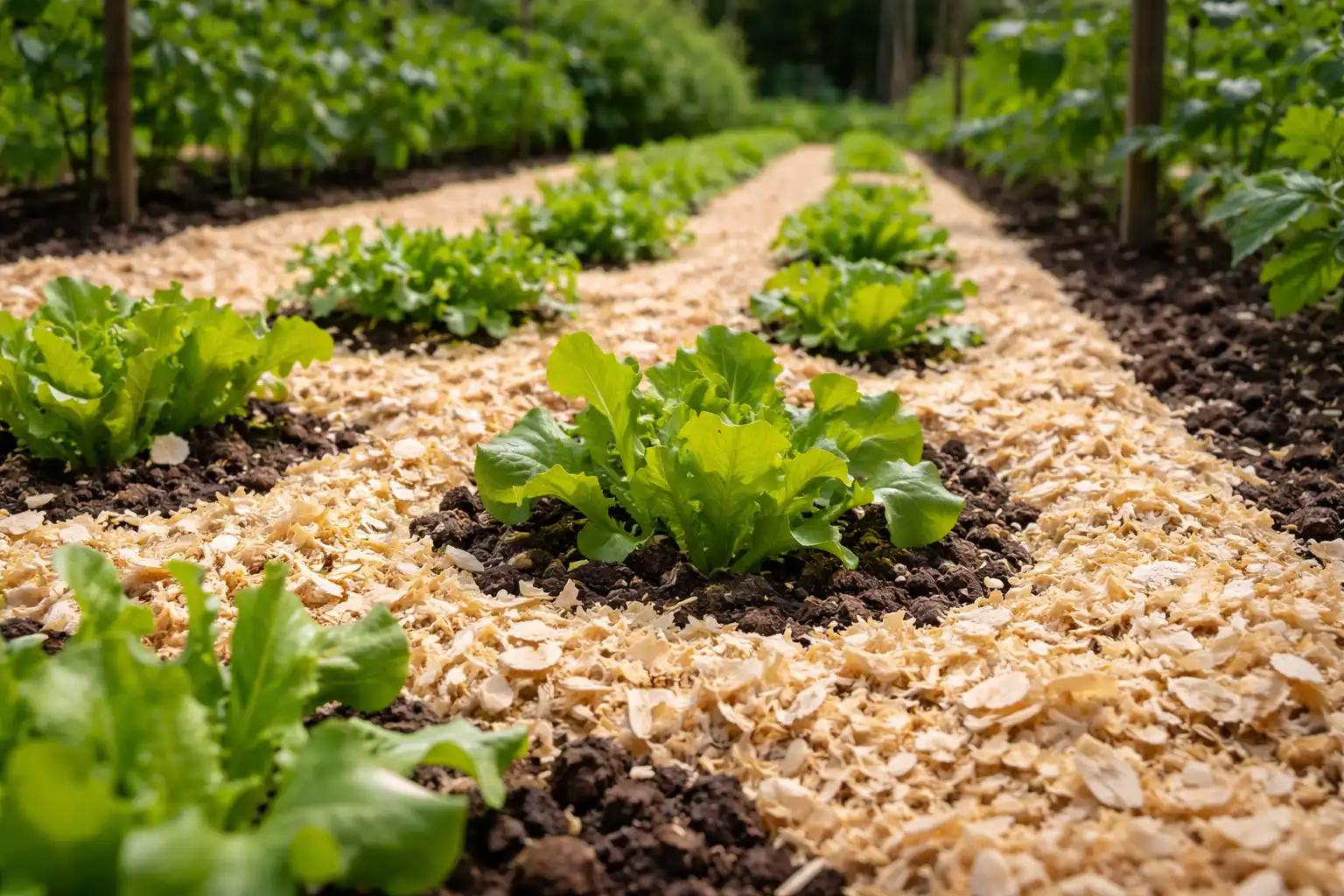 Jasne chipsy odbijają promienie słoneczne, chroniąc delikatne korzenie sadzonek przed przegrzaniem w majowym upale.