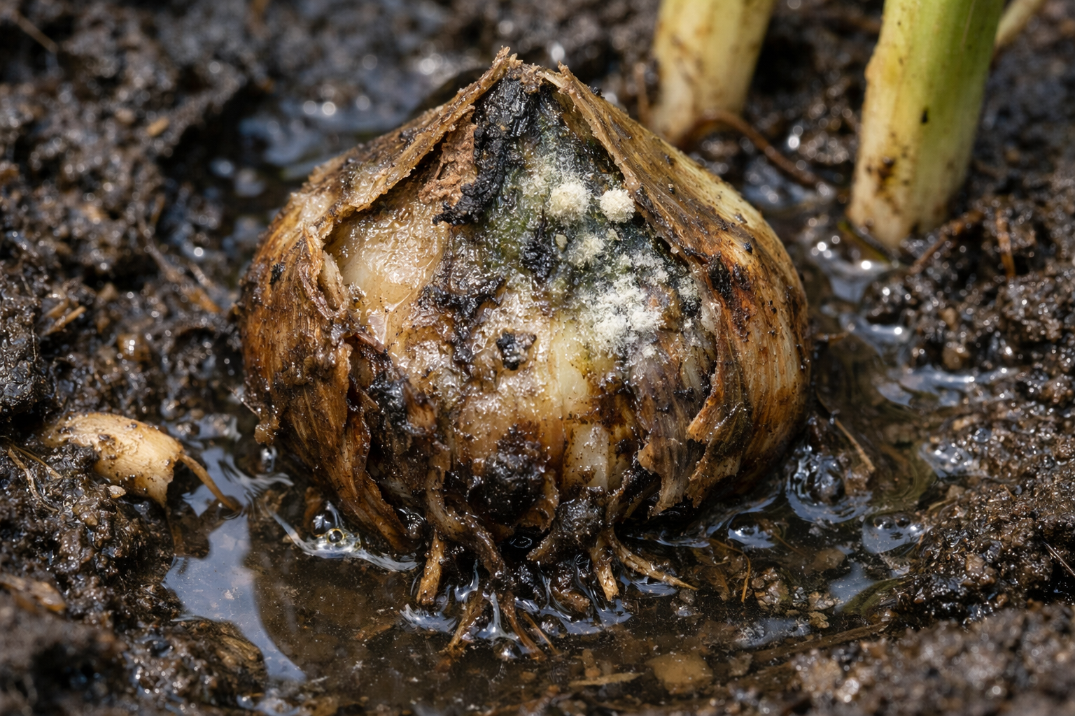 Kiedy gleba jest stale mokra, gleba jest zaburzona wymiana gazowa w strefie korzeniowej. Cebulka tulipana jest zasadniczo ściśniętym pączkiem z zapasem składników odżywczych, który jest bardzo podatny na infekcje grzybicze. Nadmierne podlewanie rozpoczyna ten proces rozkład beztlenowyktóry najpierw niszczy pączek kwiatowy wewnątrz łuski.