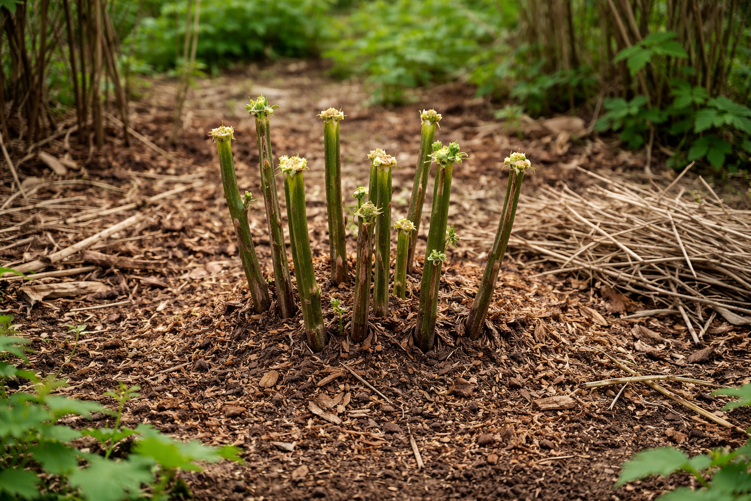 Wszystkie ścięte gałęzie należy natychmiast usunąć z terenu lub zniszczyć, ponieważ zimują w nich larwy mucha malinowa.