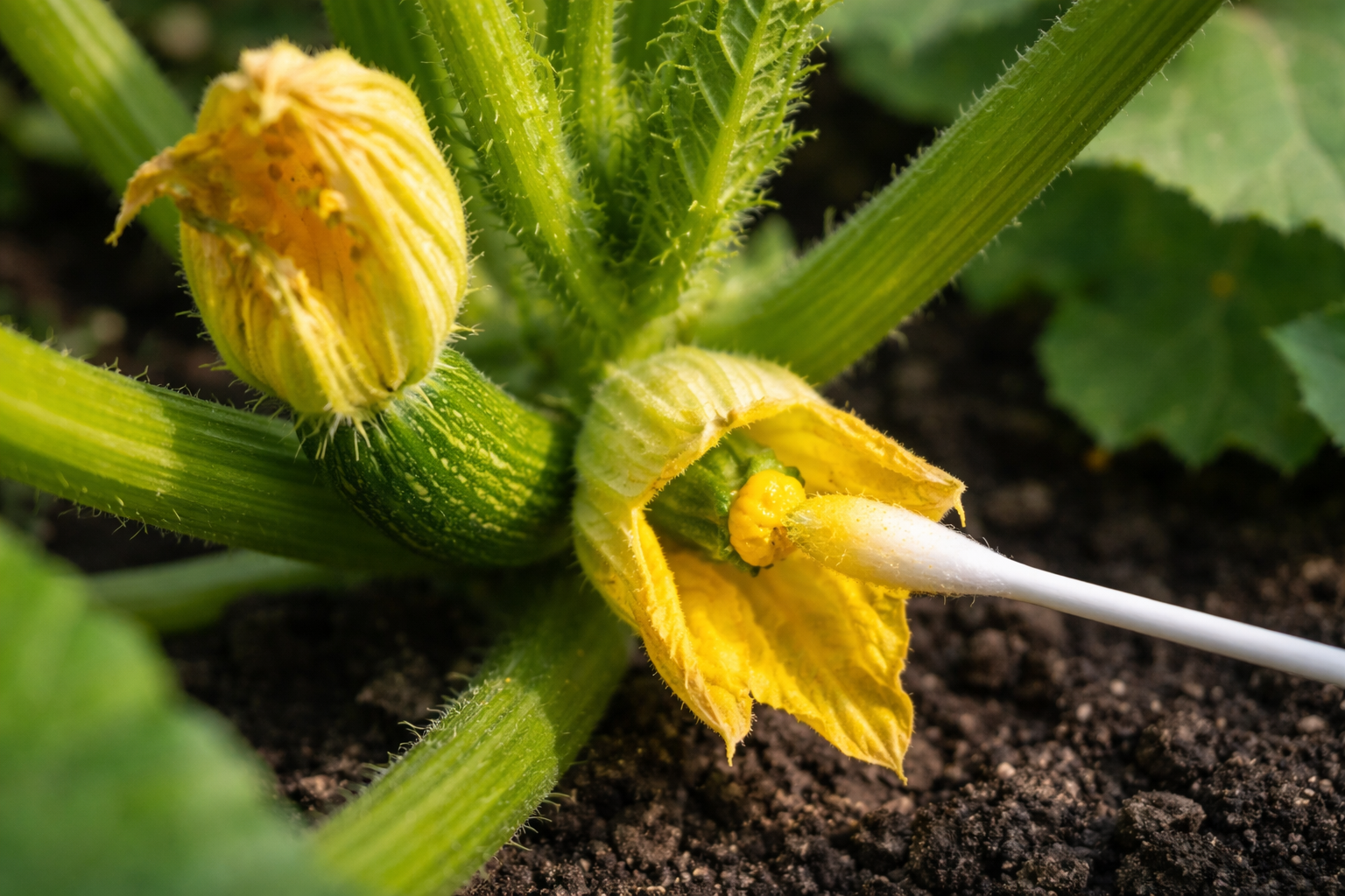 Zerwij kwiat męski, ostrożnie usuń płatki i dotknij środka kwiatu żeńskiego (ma małą kopię cukinii u podstawy) pręcikiem.