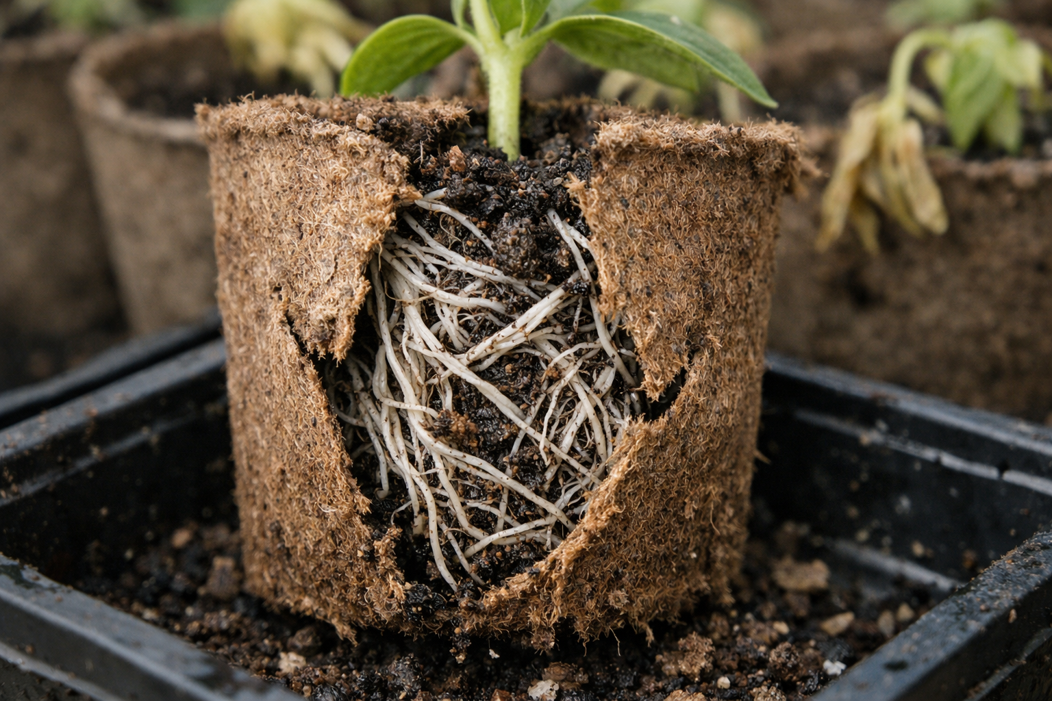 Najczęstszym błędem jest przekonanie, że doniczka torfowa sama rozpuści się w glebie. W praktyce ścianki są często zbyt gęste. Korzenie ogórka nie mogą się przez nie przebić, zaczynają rosnąć do środka, tworząc zwartą bryłę, a sadzonka zaczyna rosnąć w doniczce powoli umiera z powodu braku odżywiania.