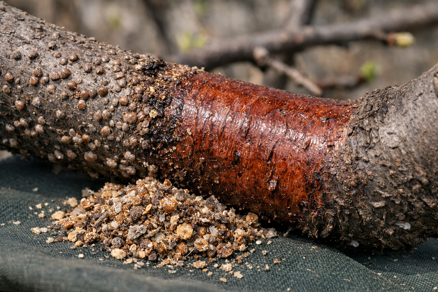 Skorupka staje się sucha, łatwo odrywa się od kory paznokciem, a pod nią nie ma żywej tkanki ani mokrych śladów.
