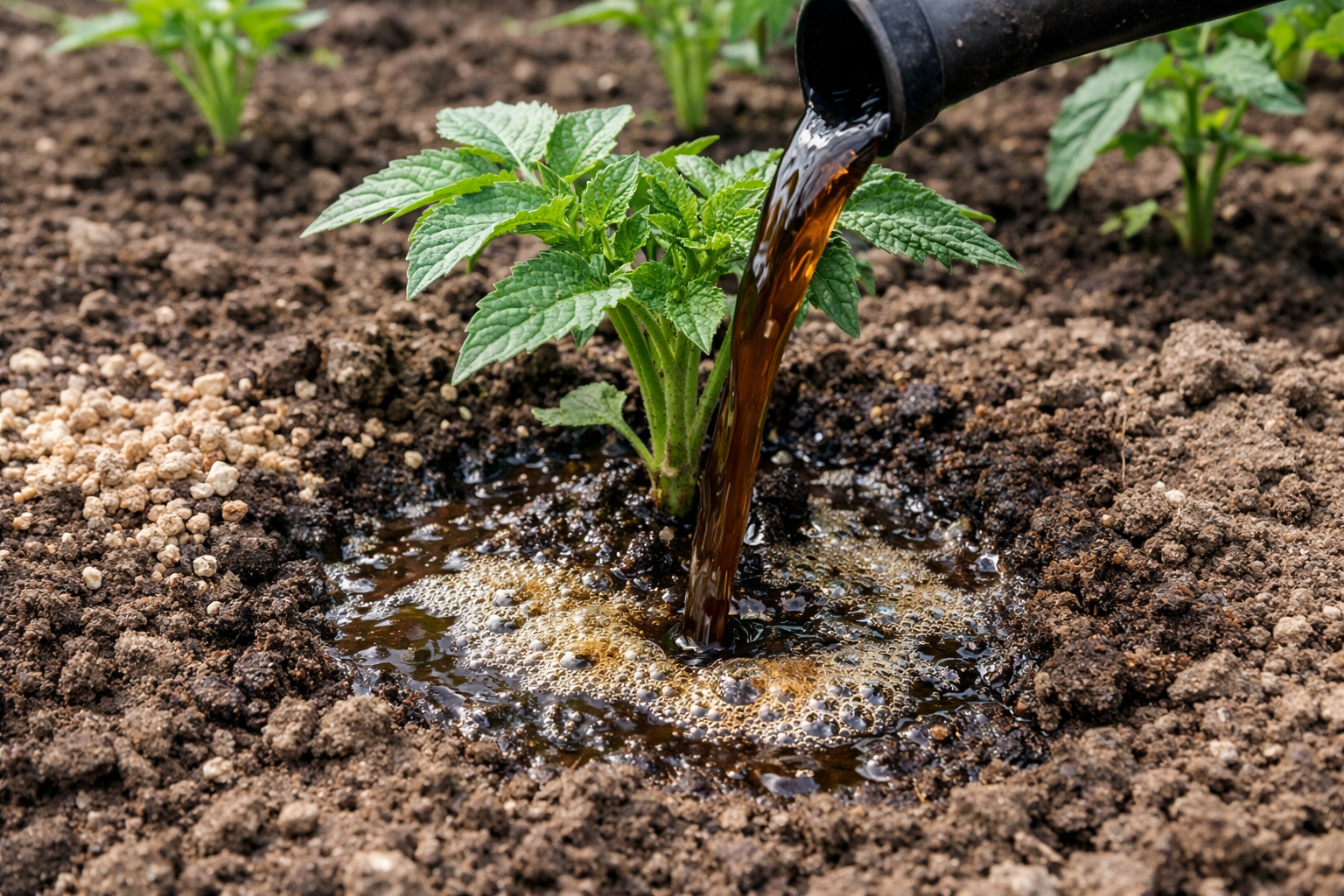 Wielu początkujących ogrodników popełnia błąd, rozsypując wiosną suchy nawóz na grządkach. Działa to zbyt wolno, a przy suchej pogodzie korzenie mogą ulec poparzeniu. Z drugiej strony napar działa jak zastrzyk wigoru, przenikając bezpośrednio do korzeni w łatwo przyswajalnej formie.
