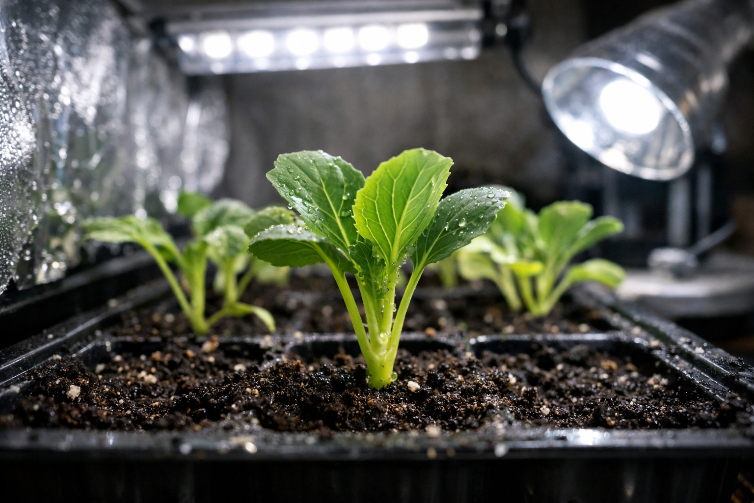 Prawidłowo ustawione oświetlenie i kontrola temperatury gwarantują silne sadzonki do wczesnych zbiorów.