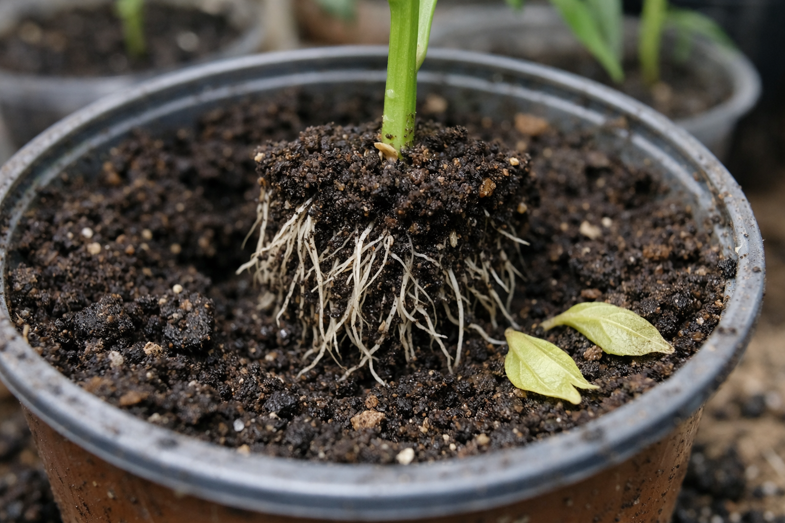 W przeciwieństwie do pomidorów, papryka ma bardzo wrażliwy system korzeniowy. Wszelkie mikrouszkodzenia zmuszają roślinę do przejścia w tryb przetrwania. Aby zaoszczędzić wilgoć i energię na regenerację korzeni, sadzonka pozbywa się „dodatkowego balastu” – liści.