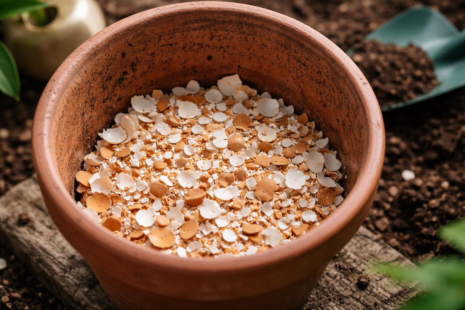 Ważna wskazówka: nie miel skorupek na pył, w przeciwnym razie podczas podlewania będą się one zbijać i blokować otwory drenażowe, tworząc odwrotny efekt stagnacji wilgoci.