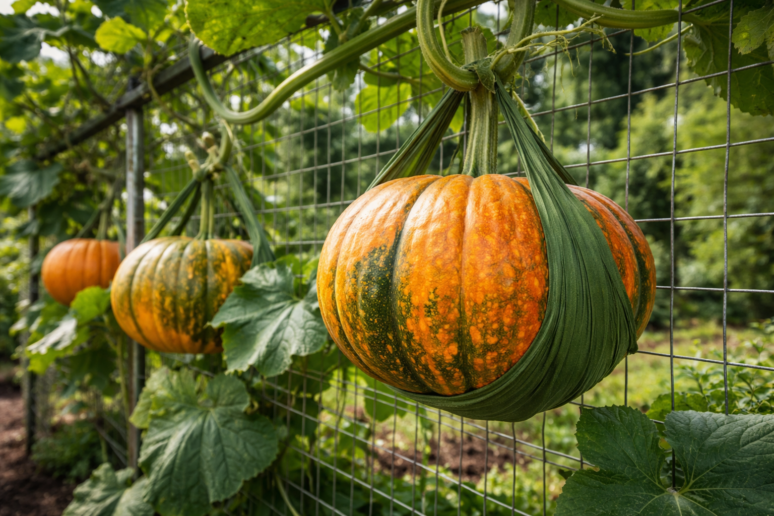 Gdy tylko młoda dynia osiągnie rozmiar piłki tenisowej, potrzebuje bezpiecznego miejsca do zawieszenia. wspierającego hamaka. Jest to prosty, mały sposób, który pozwala bezpiecznie uprawiać ciężkie okazy na wadze.