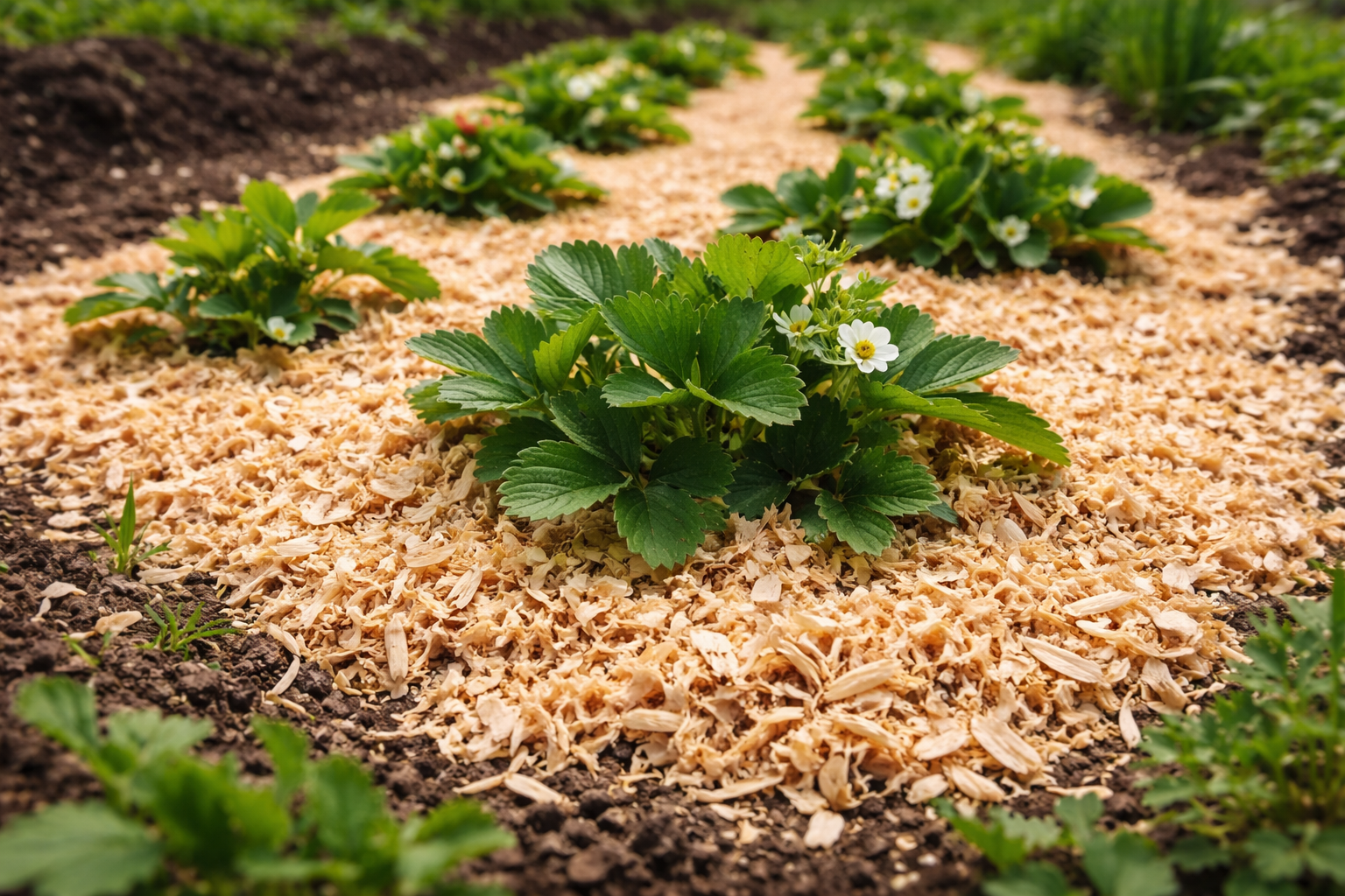 Sekretny niuans: nigdy nie rozsypuj całkowicie suchych i świeżych trocin wokół łodyg. Pamiętaj, aby posypać je mocnym roztworem mocznika lub azotanu amonu przed ich ułożeniem, aby zrekompensować niedobór azotu i rozpocząć fermentację.